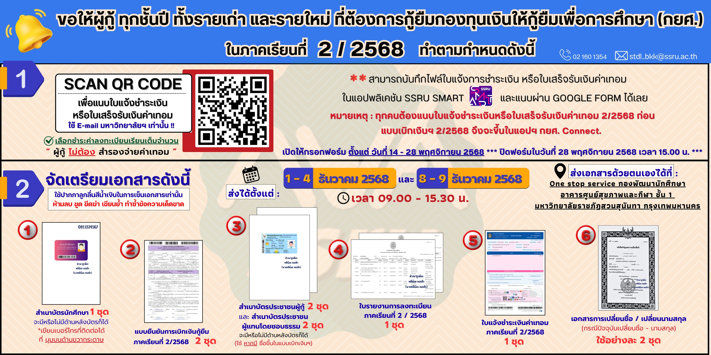 - Submission location: One Stop Service, Student Development Division, 1st Floor, Health and Sports Center, Suan Sunandha Rajabhat University, Bangkok