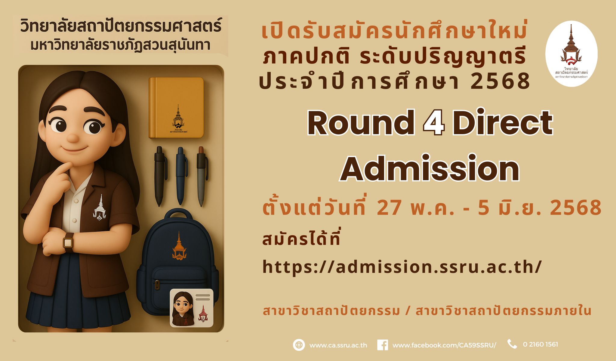 Suan Sunandha Rajabhat University, Faculty of Architecture, is now accepting applications for new students for the regular undergraduate program for the academic year 2025 (Round 4: Direct Admission). The application period is from May 27 to June 5, 2025.