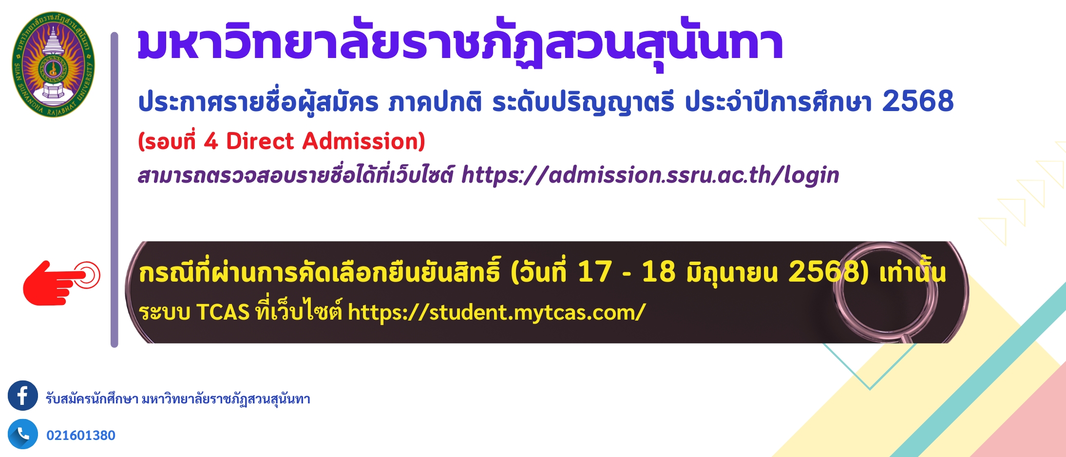 Suan Sunandha Rajabhat University announces the list of applicants for the Regular Undergraduate Program, Academic Year 2025 (Round 4: Direct Admission).