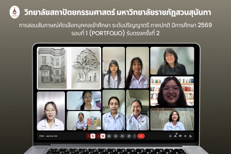 The College of Architecture, Suan Sunandha Rajabhat University, conducted interviews for the selection of candidates for the Bachelor’s Degree Program, Regular Track, Academic Year 2026, Round 1 (Portfolio) – Direct Admission (2nd Call) in the Architecture and Interior Architecture programs. The interviews were held online via Google Meet.