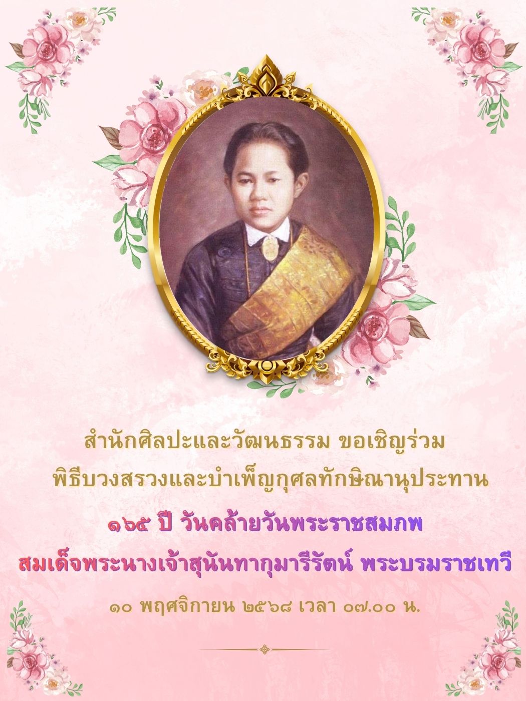 The Office of Arts and Culture cordially invites you to participate in the Boon Suang Ceremony and Merit-Making (Thaksin Anuphan) in honor of Her Majesty Queen Sunandha Kumariratana, the Queen Consort on Monday, November 10, 2025, at the front courtyard of Queen Sunandha Kumariratana Monument and Saisutthana Phadol Building.