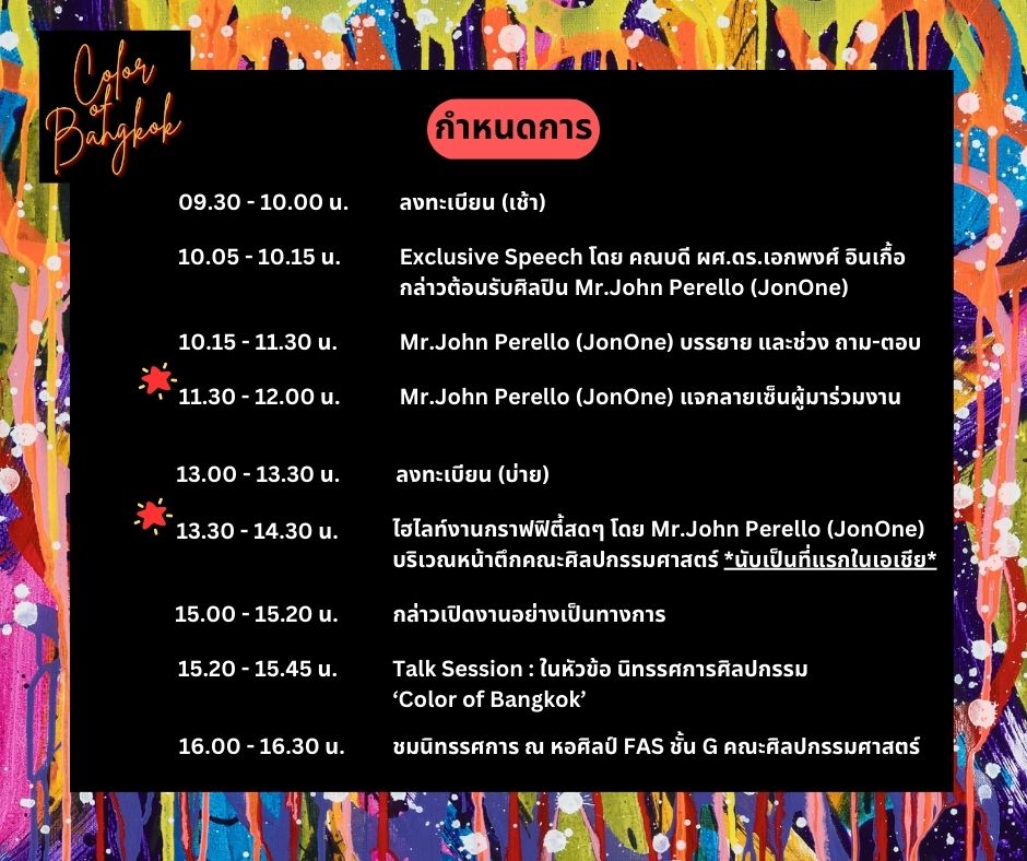 Anyone who likes street art and graffiti must come to this event. first time in Thailand. You will be able to get close to world-renowned artist "Jonone". This American artist will talk about his experiences and paint patterns on the forecourt of the Faculty of Fine Arts.