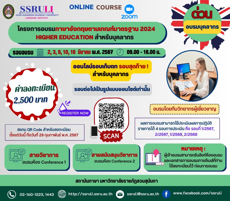 Inviting Suan Sunandha Rajabhat University personnel Those interested in registering for English language training according to the 2024 Higher Education standards, training rounds on 2, 3, 9, 10, 16 March 2024 from 9:00 a.m. - 4:00 p.m. Training in an online format (collection round).
