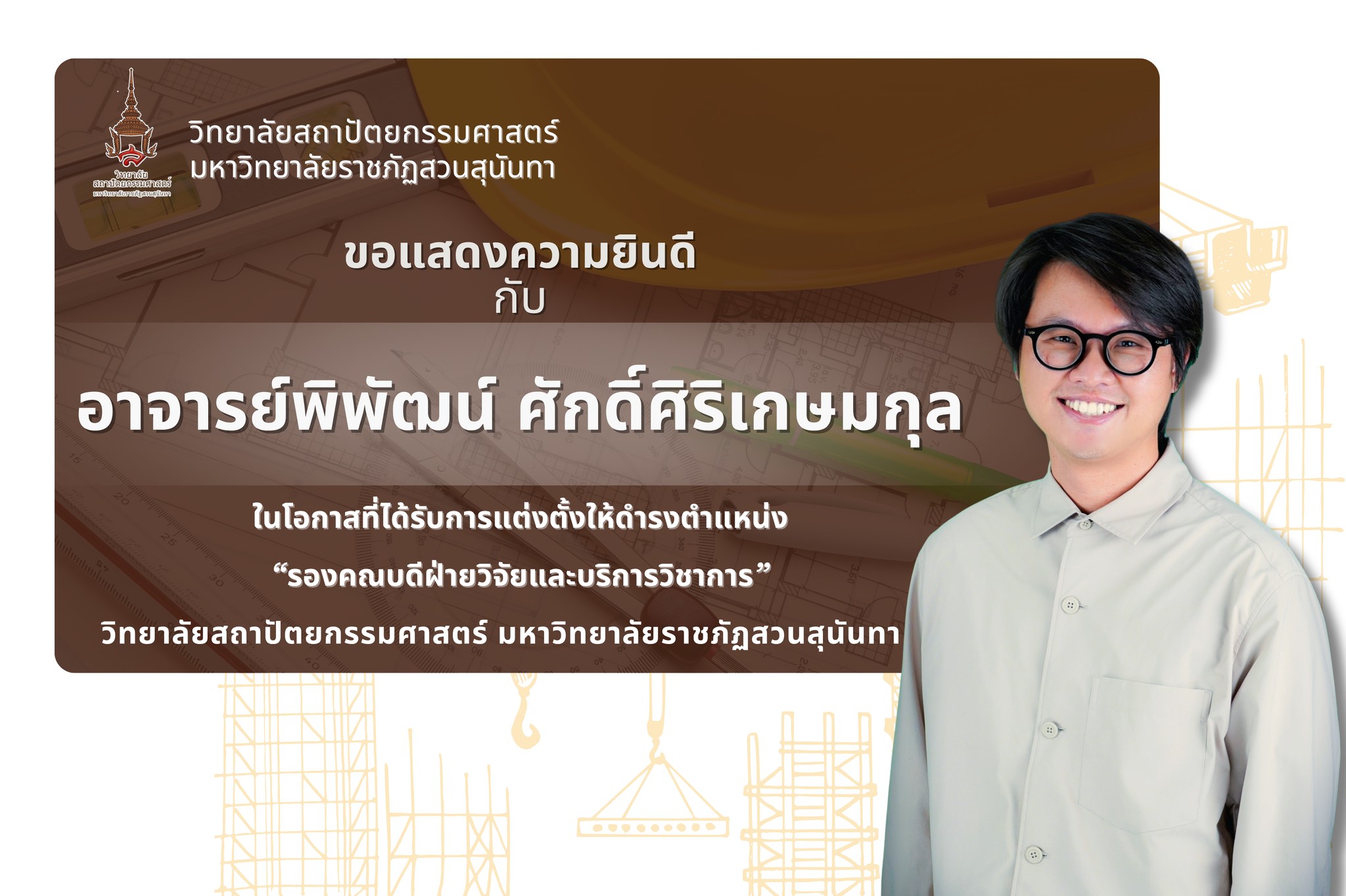 The College of Architecture, Suansunandha Rajabhat University congratulates Asst. Prof. Piphat Saksirikasemkul on his appointment as Associate Dean for Research and Academic Services at the College of Architecture.