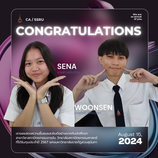 I would like to express my deep appreciation and congratulations to the students of Interior Architecture. College of Architecture that received scholarships for the year 2024 at Suan Sunandha Rajabhat University are: