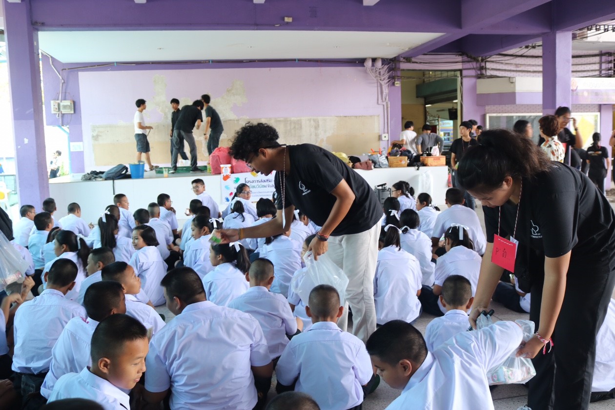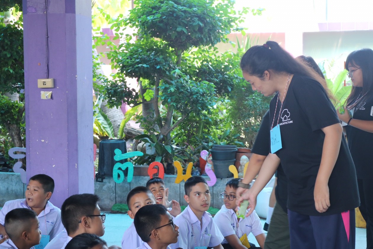 On 16th -17th of May 2019, an academic service of the College of Architecture lead by Lecturer Pawin Suttinon and organize by Lecturer Pipat Saksirikasemkul which compose of 1st year to 4th year students at Wat Sawaswareeseemaram School or commonly known as “Wat Khae Samsen School”.  There are a total of 91 elementary students joined the different activities like exciting games, songs, and painting classes. In addition, the architecture students also painted the wall of the school with various cartoon characters which are very attractive to children.