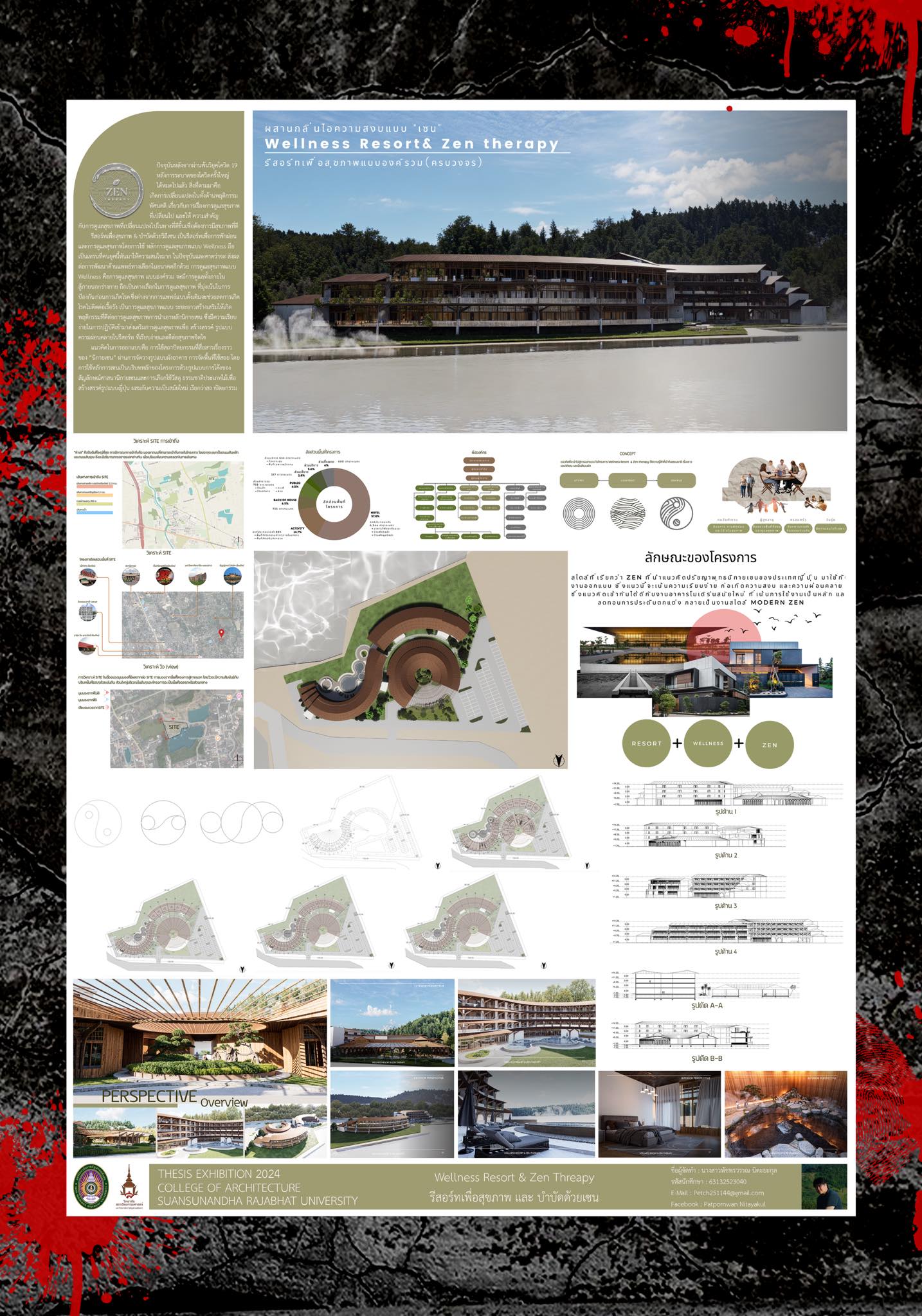แนวความคิดในการออกแบบ : รีสอร์ทเพื่อสุขภาพ & บำบัดด้วยวิถีเซน เป็นรีสอร์ทเพื่อการพักผ่อนและการดูแลสุขภาพโดย การดูแลสุขภาพแบบ Wellness คือการดูแลทั้งภายในสู้ภายนอกร่างกายที่มุ่งเน้นในการป้องกัน ก่อนการเกิดโรค ซึ่งเป็นการดูแลสุขภาพแบบ ระยะยาวสร้างเสริมให้เกิดพฤติกรรมที่ดีต่อการดูแลสุขภาพ การนำเอาหลักนิกายเซน ซึ่งมีความเรียบง่ายในการปฏิบัติเข้ามาส่งเสริมการดูแลสุขภาพเพื่อ สร้างสรรค์ รูปแบบความผ่อนคลายในรีสอร์ท ที่เรียบง่ายและดีต่อสุขภาพจิตใจ