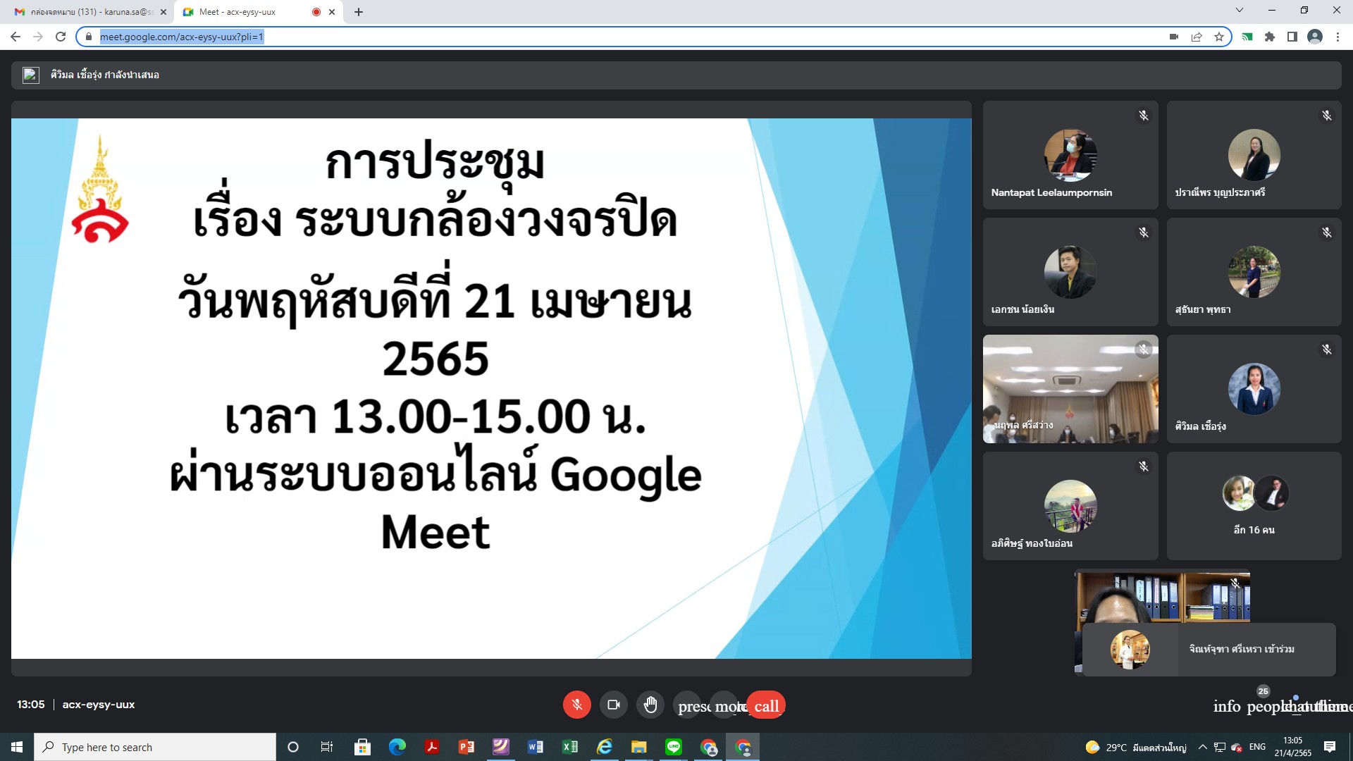21 เมษายน 2565 บุคลากรวิทยาลัยสถาปัตยกรรมศาสตร์ เข้าร่วมประชุมระบบรักษาความปลอดภัย (กล่องวงจรปิด) จัดโดยสำนักงานอธิการบดี