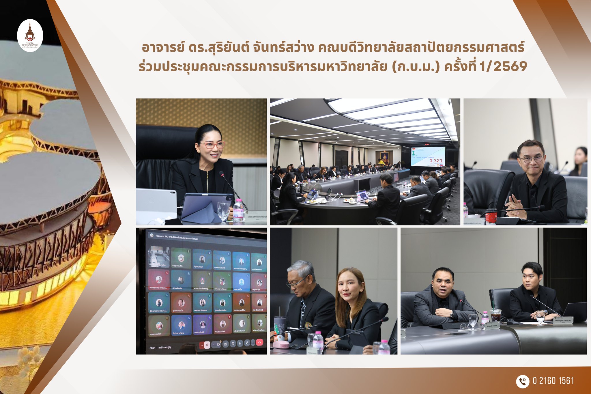 อาจารย์ ดร.สุริยันต์ จันทร์สว่าง คณบดีวิทยาลัยสถาปัตยกรรมศาสตร์ มหาวิทยาลัยราชภัฏสวนสุนันทา เข้าร่วมการประชุมคณะกรรมการบริหารมหาวิทยาลัยราชภัฏสวนสุนันทา (ก.บ.ม.) ครั้งที่ 1/2569 โดยมี รองศาสตราจารย์ ดร.ชุติกาญจน์ ศรีวิบูลย์ อธิการบดีมหาวิทยาลัยราชภัฏสวนสุนันทา เป็นประธานในการประชุม ณ ห้องประชุมสภามหาวิทยาลัย อาคาร 31 ชั้น 5 พร้อมด้วย นายศักรินทร์ สาระรักษ์ หัวหน้าสำนักงาน เข้าร่วมการประชุมผ่านระบบ Google Meet