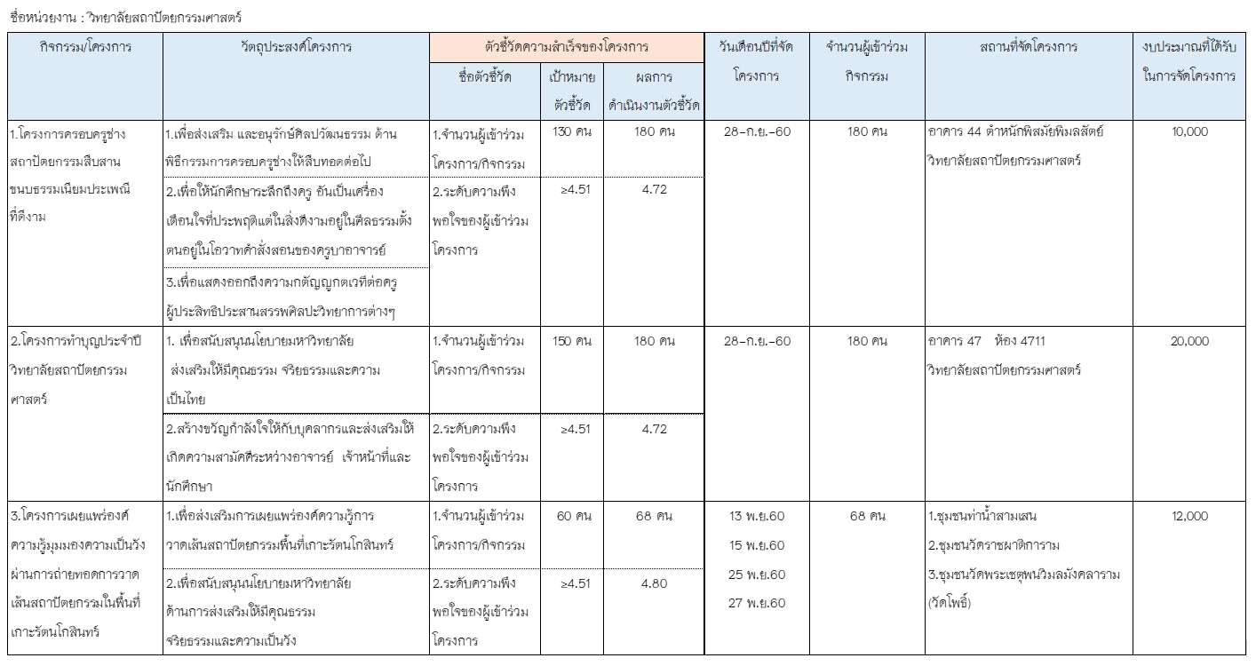 28 กันยายน 2560 :  ครบรอบ 1 ปี วันสถาปนาวิทยาลัยสถาปัตยกรรมศาสตร์ มหาวิทยาลัยราชภัฏสวนสุนันทา ทำบุญเลี้ยงพระ มอบทุนการศึกษา-วุฒิบัตรแก่นักศึกษาที่มีผลการเรียน "ดีมาก" พิธีครอบครู-ไหว้ครู สร้างความรัก ความสามัคคีระหว่างรุ่นพี่รุ่นน้อง ครูบาอาจารย์ ณ อาคารพิสมัยพิมลสัตย์ และห้อง 4711 อาคารคณะเทคโนโลยีอุตสาหกรรม