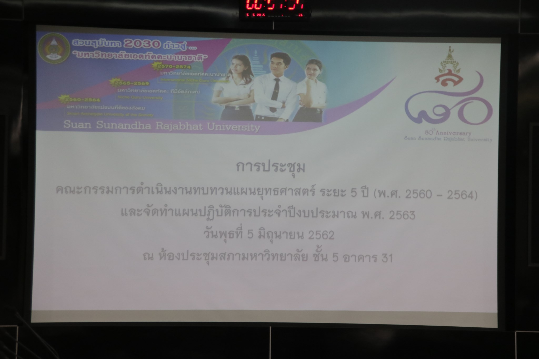 วันที่ 5 มิถุนายน 2562 เวลา 09.00 น. ณ ห้องประชุมสภามหาวิทยาลัย ชั้น 5 อาคาร 31 ผศ.ดร.สมบูรณ์ เวสน์ คณบดีวิทยาลัยสถาปัตยกรรมศาสตร์ พร้อมด้วย อาจารย์พิพัฒน์ ศิกดิ์ศิริเกษมกุล รองคณบดีฝ่ายแผนงานและประกันคุณภาพ เข้าร่วมประชุมคณะกรรมการดำเนินงานทบทวนยุทธศาสตร์ ระยะ 5 ปี (พ.ศ.2560-2564) และจัดทำแผนการปฏิบัติการประจำปีงบประมาณ พ.ศ.2563 โดยมี โดยมี รศ.ดร.ฤๅเดช เกิดวิชัย อธิการบดี เป็นประธาน การประชุมครั้งนี้เป็นหารือผู้บริหารเพื่อกำหนดทิศทางในอนาคตของมหาวิทยาลัยพร้อมรับการปรับเปลี่ยนสังกัดสู่กระทรวงใหม่ ดำเนินการการประชุมโดยกองนโยบายและแผน สำนักงานอธิการบดี