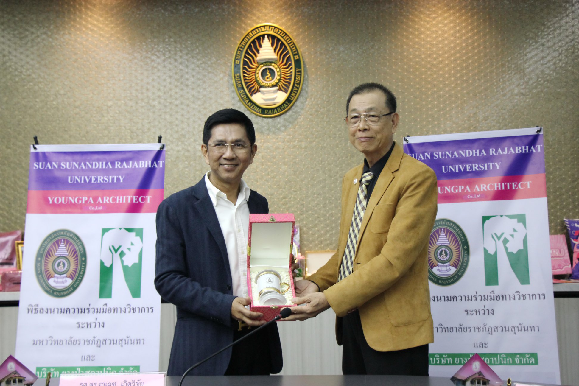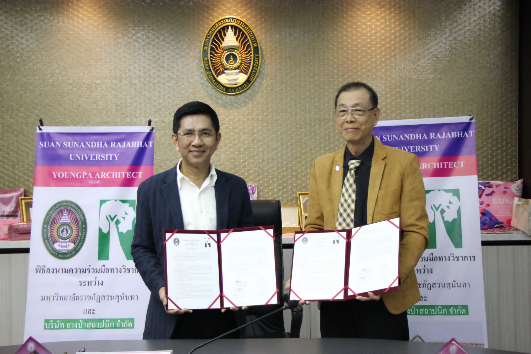 7 มิถุนายน 2562 เวลา 10.00 น. วิทยาลัยสถาปัตยกรรมศาสตร์ จัดพิธีลงนามบันทึกข้อตกลงความร่วมมือทางวิชาการ ระหว่าง มหาวิทยาลัยราชภัฏสวนสุนันทา กับ บริษัท ยางป่าสถาปนิก จำกัด โดยมี รศ.ดร.ฤๅเดช เกิดวิชัย อธิการบดีมหาวิทยาลัยราชภัฏสวนสุนันทา และ คุณวิจิตร ศิลาวิเศษฤทธิ์ ประธานกรรมการ บริษัท ยางป่าสถาปนิก จำกัด เป็นผู้ลงนาม ณ ห้องประชุมสภามหาวิทยาลัย ชั้น 5 อาคาร 31