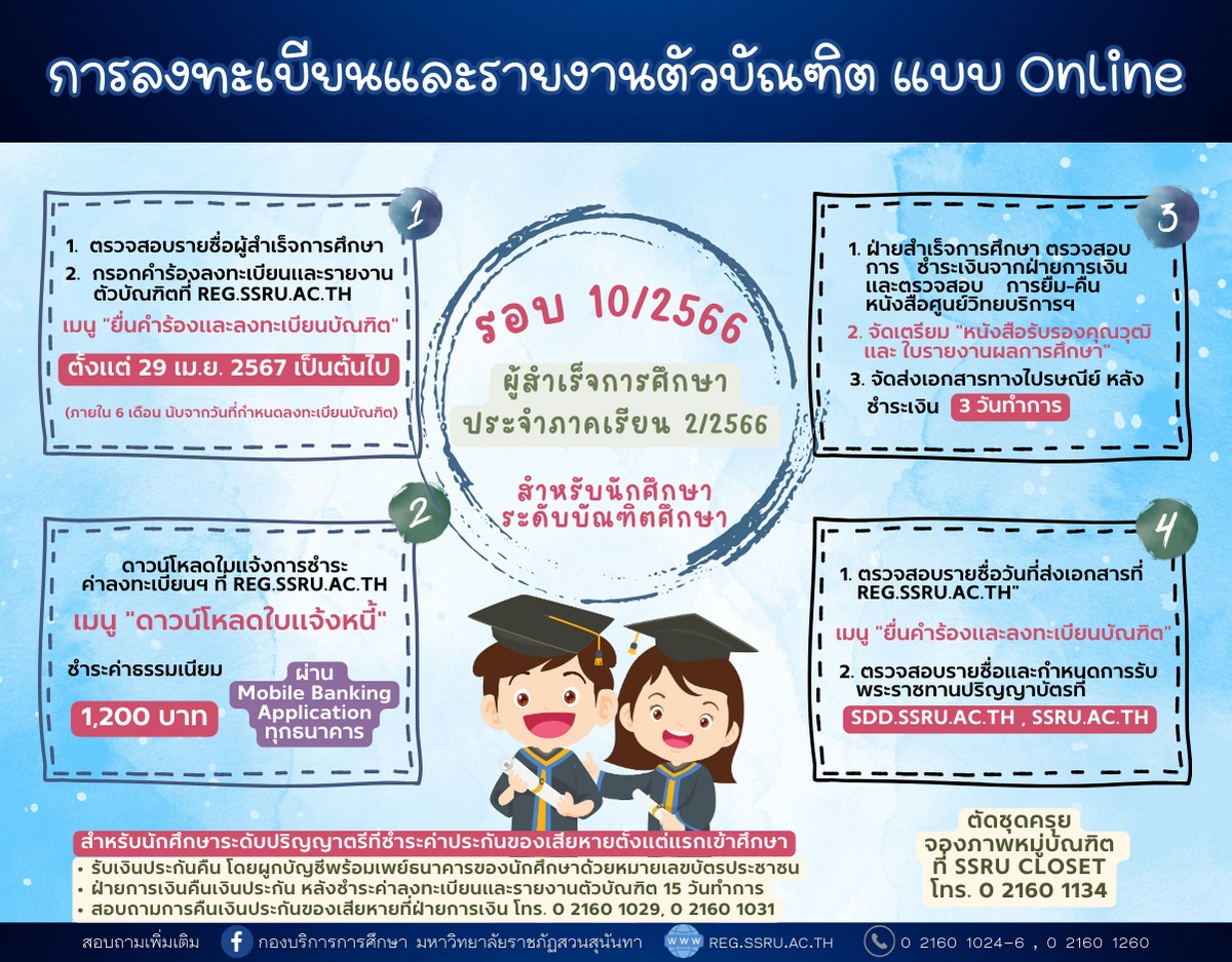 การลงทะเบียนและรายงานตัวบัณฑิต เพื่อรับเอกสารสำคัญทางการศึกษา ประจำปีการศึกษา 2566 รอบที่ 10/2566 สำหรับนักศึกษาระดับบัณฑิตศึกษา ตั้งแต่วันที่ 29 เมษายน 2567 เป็นต้นไป ที่ reg.ssru.ac.th