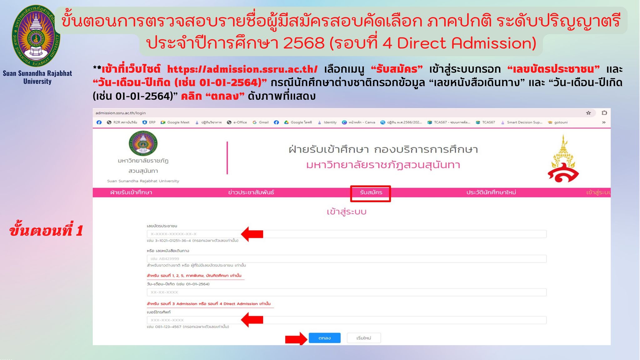 สามารถตรวจสอบรายชื่อได้ที่เว็บไซต์ https://admission.ssru.ac.th/login