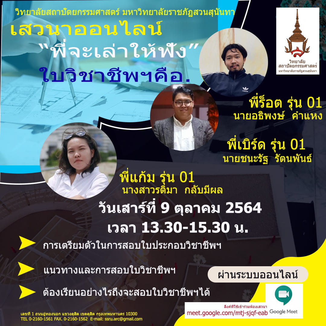 สโมสรนักศึกษษฯ เชิญนักศึกษาทุกคนที่สนใจ เข้าร่วมกิจกรรมสนุกแบบออนไลน์ "เสวนาออนไลน์ พี่จะเล่นให้ฟัง ใบวิชาชีพคือ" โดยการเชิญพี่ๆที่จบแล้วและสามารถสอบใบวิชาชีพสถาปัตยกรรมได้ มาพูดคุยและแนะนำการเตรียมตัวสอบใบวิชาชีพฯ ในวันเสาร์ที่ 9 ตุลาคม เวลา 13.30-15.30 น.(ระบบออนไลน์ google meet)