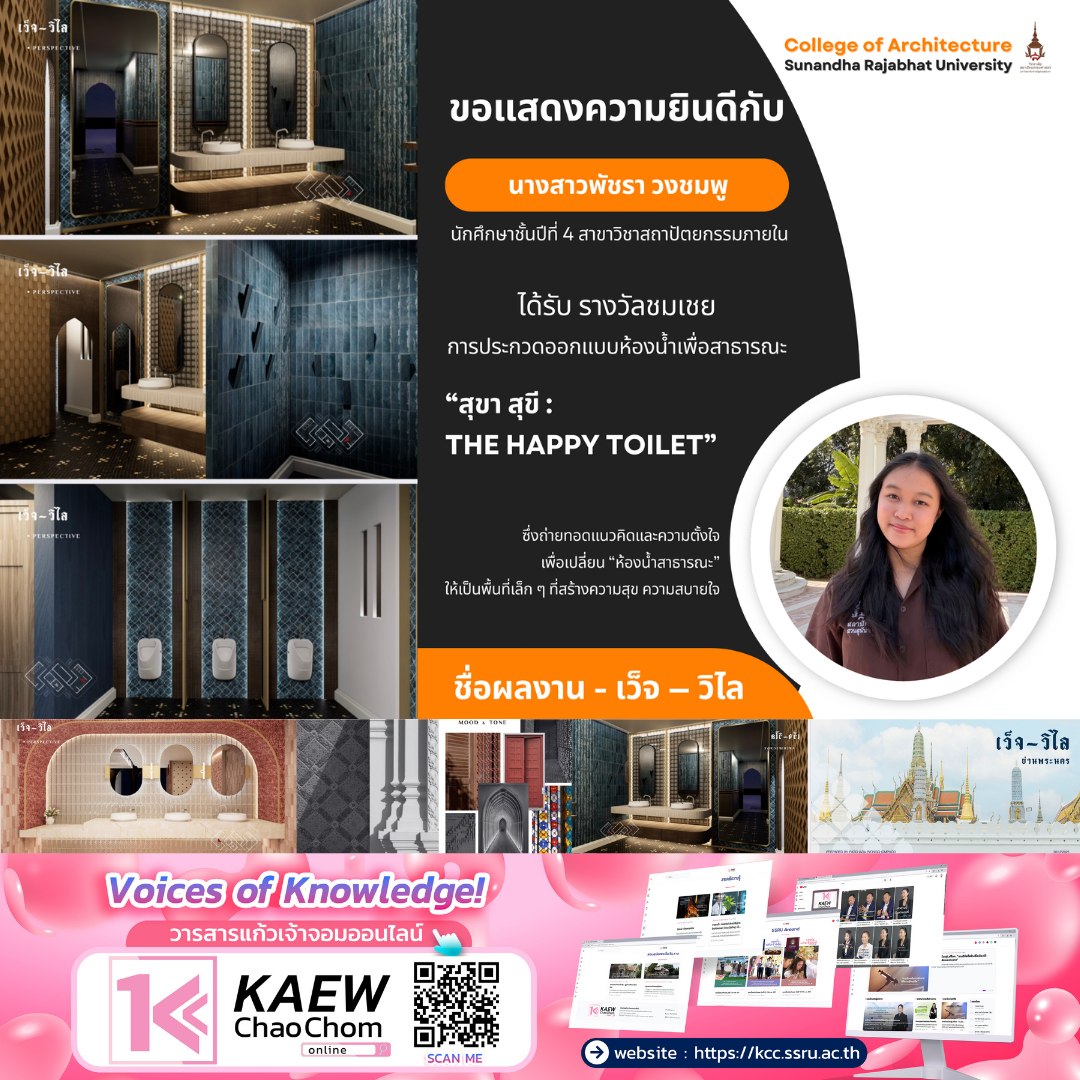 วิทยาลัยสถาปัตยกรรมศาสตร์ มหาวิทยาลัยราชภัฏสวนสุนันทา ขอร่วมแสดงความยินดีกับ นางสาวพัชรา วงชมพู นักศึกษาชั้นปีที่ 4 สาขาวิชาสถาปัตยกรรมภายใน ที่สร้างผลงานโดดเด่นจนได้รับ รางวัลชมเชย จากการประกวดออกแบบห้องน้ำสาธารณะในโครงการ