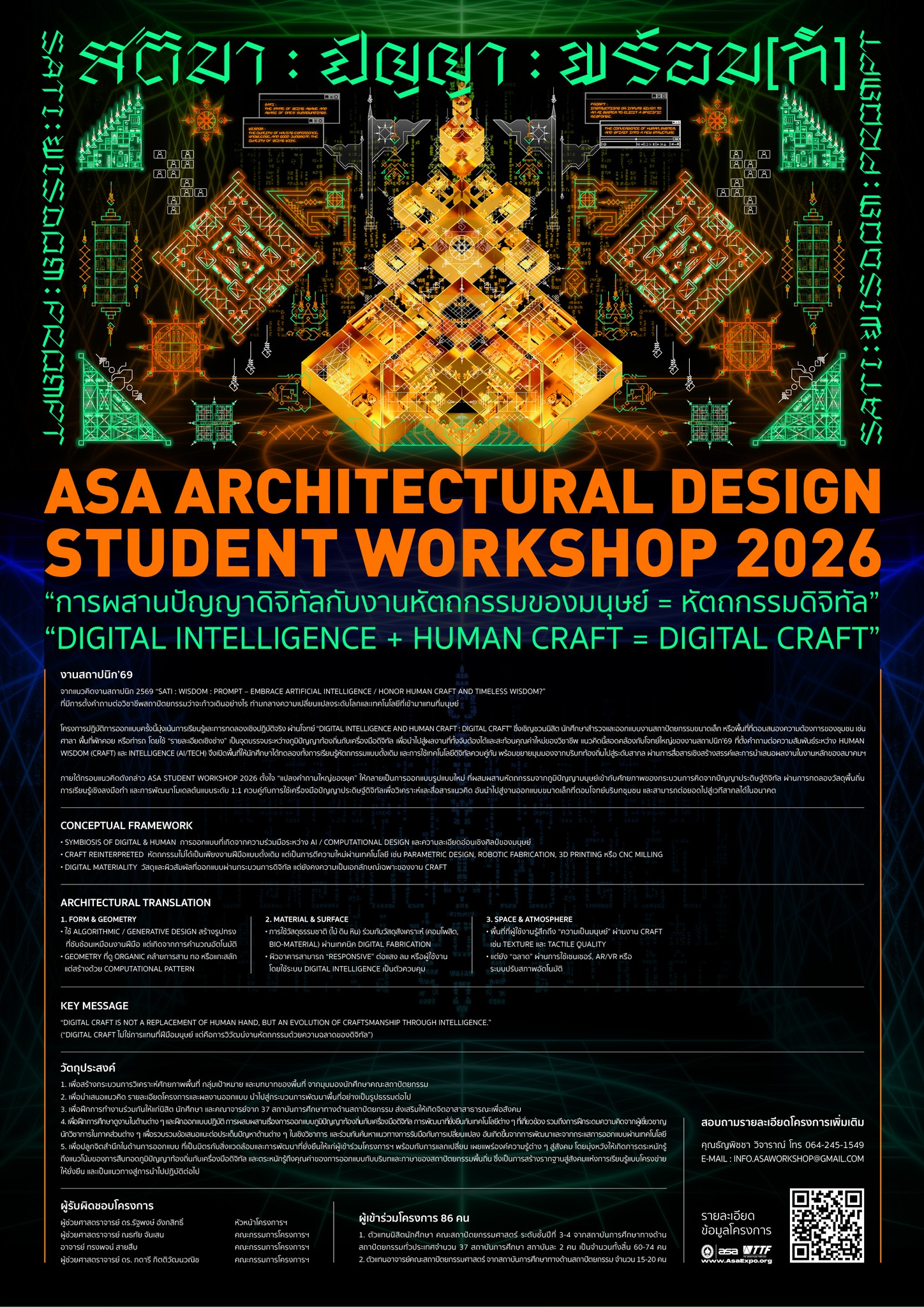 ASA Architectural Design Student Workshop 2026 ชวนนิสิต นักศึกษาสถาปัตย์รุ่นใหม่มาลอง คิด - ทำ - ทดลอง ผ่านโจทย์ “Digital Intelligence and Human Craft: Digital Craft”