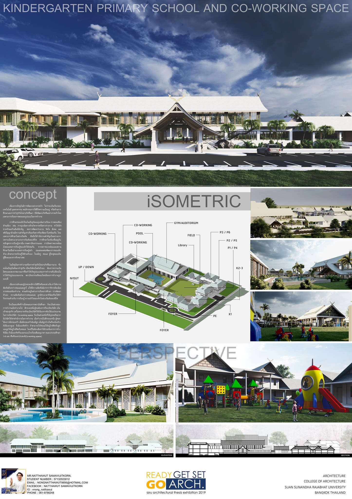 โครงการ โรงเรียนอนุบาลศึกษา ประถมศึกษาและพื้นที่อเนกประสงค์ (Kindergarten primary school and Co-working space) เนื่องจากในปัจจุบันมีการพัฒนาอย่างรวดเร็ว ไม่ว่าจะเป็นเรื่องของเทคโนโลยี อุตสาหกรรม พฤติกรรมการใช้ชีวิต ความเป็นอยู่ ด้านการศึกษาและการทำงาน ที่ทำให้เกิดการเปลี่ยนแปลงอย่างมากมาย พฤติกรรมที่เปลี่ยนไป การทำงานและการมีครอบครัวเป็นส่วนหนึ่งของชีวิต จึงมองเห็นถึงความสัมพันธ์ระหว่าง พ่อ แม่ และลูก ที่ได้อยู่ใกล้ชิดกัน ในระหว่างพ่อ แม่ทำงาน ส่วนเด็กได้เรียนหนังสือ โครงการนี้จึงออกแบบให้มีส่วนของการเรียน การศึกในชั้นเรียนตั้งแต่เตรียมอนุบาล-ประถมศึกษาปีที่6 และส่วนของพื้นที่อเนกประสงค์ ที่ใช้สำหรับการทำงานออฟฟิต การพบปะพูดคุยเรื่องธุรกิจ |