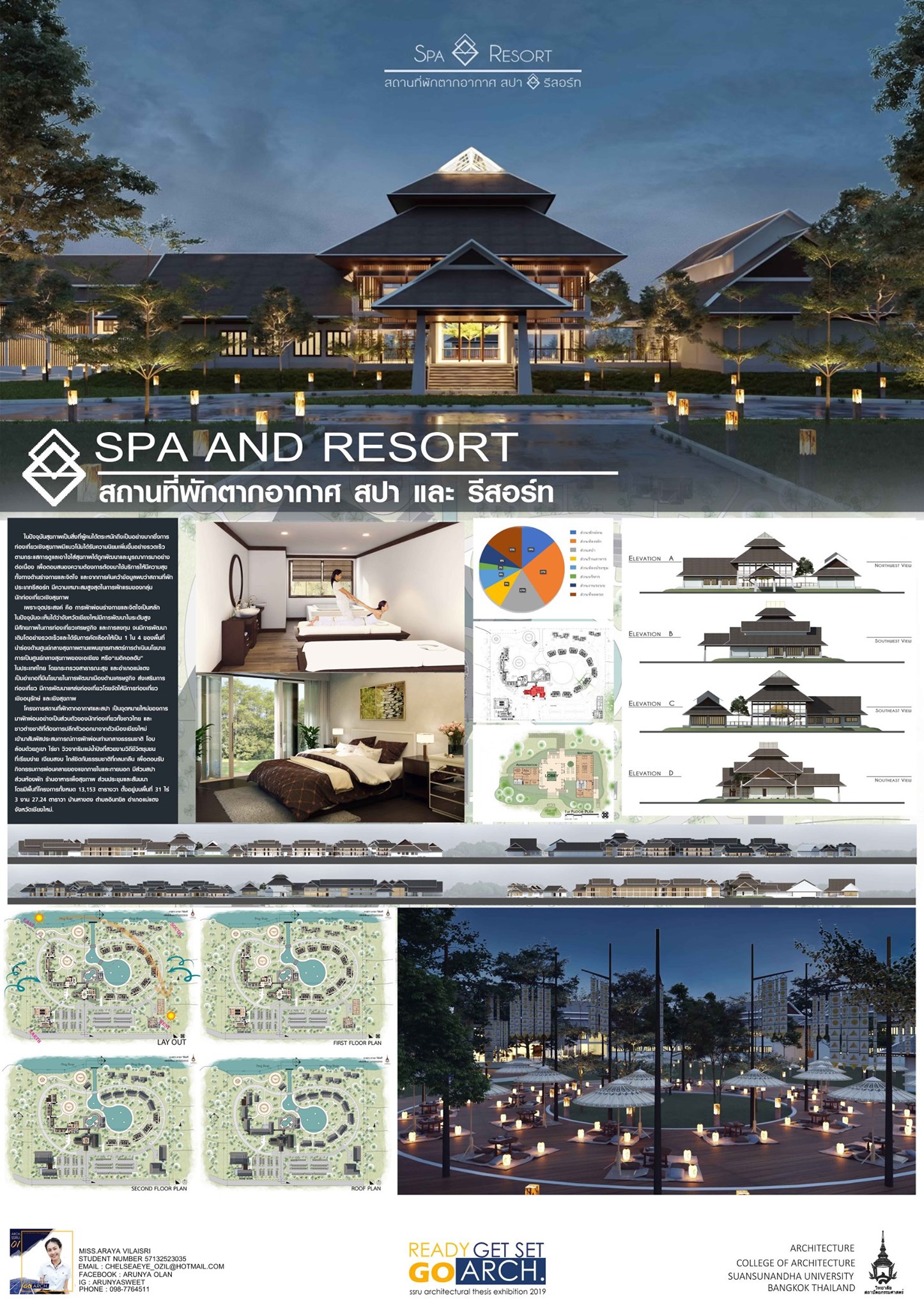 รหัสนักศึกษา 57132523035 โครงการ สถานที่พักตากอากาศ (Spa and Resort) ในปัจจุบันมีผู้ที่หันมาดูแลสุขภาพกันมากขึ้น การบำบัดรักษาโดยวิถีทางธรรมชาติจึงเป็นสิ่งที่ตอบสนองความต้องการของกลุ่มคนเหล่านี้ จึงได้จัดทำโครงการสถานที่พักตากอากาศขึ้นมาบนพื้นที่ อำเภอแม่แตง จังหวัดเชียงใหม่ ซึ่งเป็นสถานที่ที่ผ่านการสำรวจในเรื่องของทำเลที่ตั้งที่เหมาะสมกับโครงการ โดยแนวความคิดในการออกแบบรูปทรงและที่ว่างทางสถาปัตยกรรมได้ออกแบบให้เป็นการบำบัดท่ามกลางธรรมชาติที่สัมผัสได้ อาคารวางล้อมบ่อน้ำขนาดใหญ่ ผู้ที่เข้ามาใช้งานจะรู้สึกถึงความสงบตั้งแต่เข้ามา เนื่องจากมีการใช้น้ำ เสียง และกลิ่นจากธรรมชาติเข้ามาช่วยสร้างบรรยากาศ เพื่อการส่งเสริมสุขภาพทั้งร่างกายและจิตใจ |