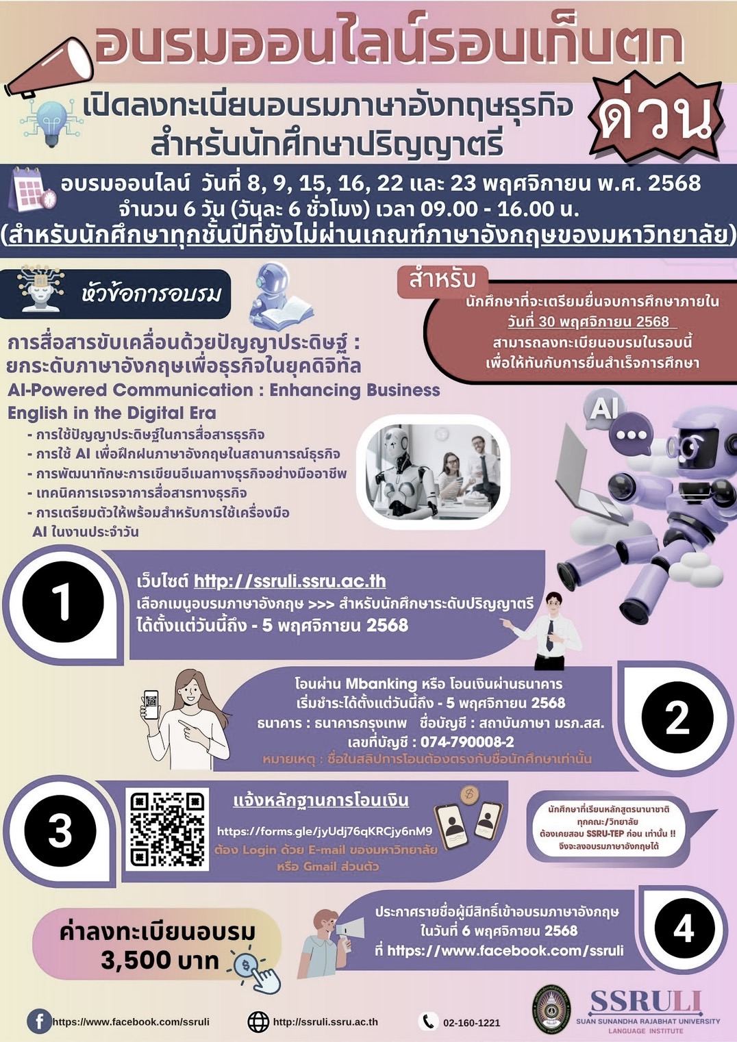 สามารถลงทะเบียนได้ที่ลิงก์ https://ssruli.ssru.ac.th/langilpc2-stutraining