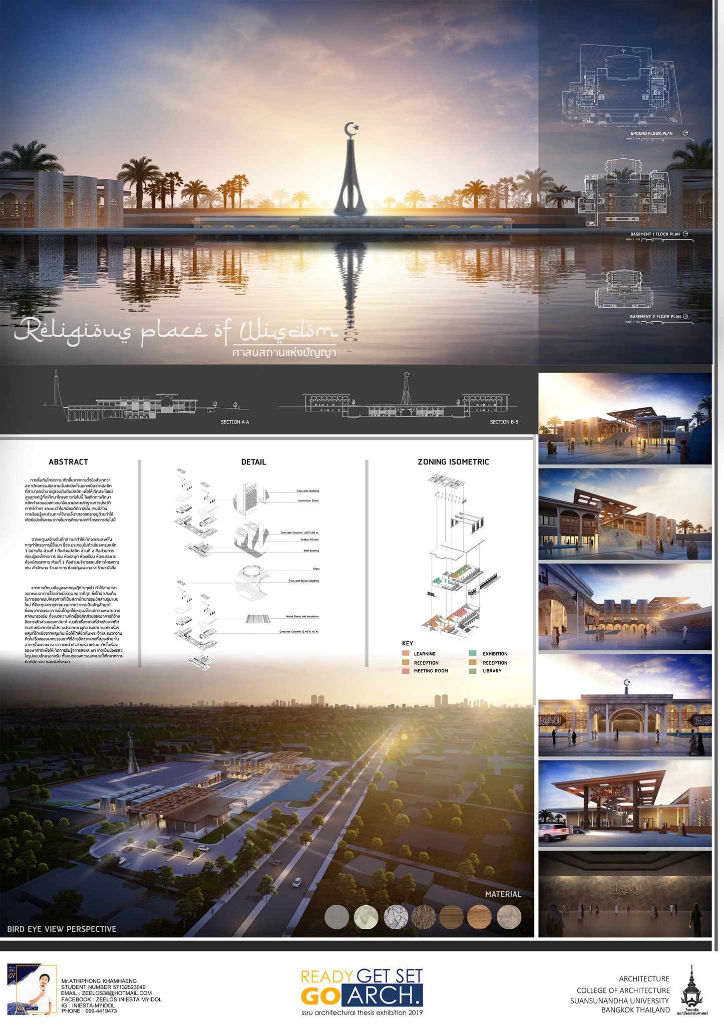 รหัสนักศึกษา 57132523049 โครงการ ศาสนสถานแห่งปัญญา (Riligious place of wisdom) การเริ่มต้นโครงการ เกิดขึ้นจากการตั้งข้อสังเกตว่าสถาปัตยกรรมอิสลามนั้นยังมีอะไรนอกเหนือจากมัสยิดที่สามารถนำมาอยู่รวมกันกับมัสยิด เพื่อให้เกิดประโยชน์สูงสุดแก่ผู้ที่จะศึกษาโครงการต่อไปนี้ จึงเกิดการศึกษาหลักคำสอนของศาสนาอิสลามและหลักฐานทางประวัติศาสตร์ต่าง ๆ และพบว่าในสมัยอดีตกาลนั้น เคยมีส่วนการเรียนรู้และส่วนการใช้งานอื่น ๆสอดแทรกอยู่ด้วยทำให้เกิดข้อบ่งชี้และแนวทางในการศึกษาและทำโครงการต่อไปนี้ จากเหตุผลข้างต้นที่กล่าวมาทำให้เกิดจุดประสงค์ในการทำโครงการนี้ขึ้นมา ซึ่งจะประกอบไปด้วยโปรแกรมหลัก3 อย่างคือ ส่วนที่ 1 คือส่วนมัสยิด ส่วนที่ 2 คือส่วนการเรียนรู้ของโครงการ เช่น ห้องสมุด ห้องเรียน ห้องบรรยายห้องนิทรรศการ ส่วนที่ 3 คือส่วนบริหารและบริการโครงการเช่น สำนักงาน ร้านอาหาร ห้องปฐมพยาบาล ร้านหนังสือ จากการศึกษาข้อมูลและทฤษฎีต่าง ๆแล้ว ทำให้สามารถออกแบบอาคารได้อย่างมีเหตุผลมากที่สุด ซึ่งได้นำประเด็นในการออกแบบโครงการที่เป็นสถาปัตยกรรมอิสลามรูปแบบใหม่ ที่มีเหตุผลทางศาสนามากกว่าการเป็นสัญลักษณ์ ซึ่งแนวคิดของอาคารนั้นได้ถูกให้เหตุผลโดยมีความหมายทางศาสนารองรับ ทั้งแนวความคิดเรื่องสัดส่วนของอาคารที่อ้างอิงจากสัดส่วนของกะอ์บะห์ แนวคิดเรื่องแกนที่อ้างอิงจากทิศกิบลัตหรือทิศที่หันไปทางประเทศซาอุดิอาระเบีย แนวคิดเรื่องหลุมที่อ้างอิงจากหลุมดินเพื่อให้ใกล้ชิดกับพระเจ้าและแนวความ คิดในเรื่องของแสงธรรมชาติที่อ้างอิงจากแสงที่ส่องเข้ามาในอาคารในแต่ละช่วงเวลา และนำตัวอักษรอาหรับมาคิดในเรื่องของฟาสาดเพื่อให้เกิดการรับรู้จากแสงและเงา เกิดเป็นช่องแสงในรูปแบบอักษรอาหรับ ทั้งหมดของการออกแบบนี้เกิดจากการคิดที่มีศาสนารองรับทั้งหมด |