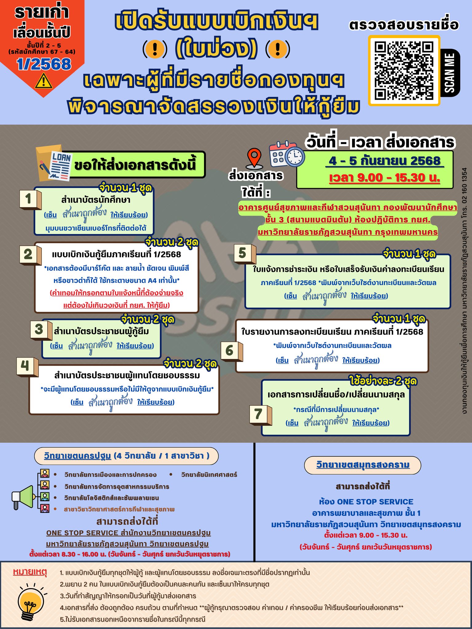 ส่งเอกสารได้ที่ : อาคารศูนย์สุขภาพและกีฬาสวนสุนันทา กองพัฒนานักศึกษา ชั้น 3 (สนามแบดมินตัน) ห้องปฏิบัติการ กยศ.