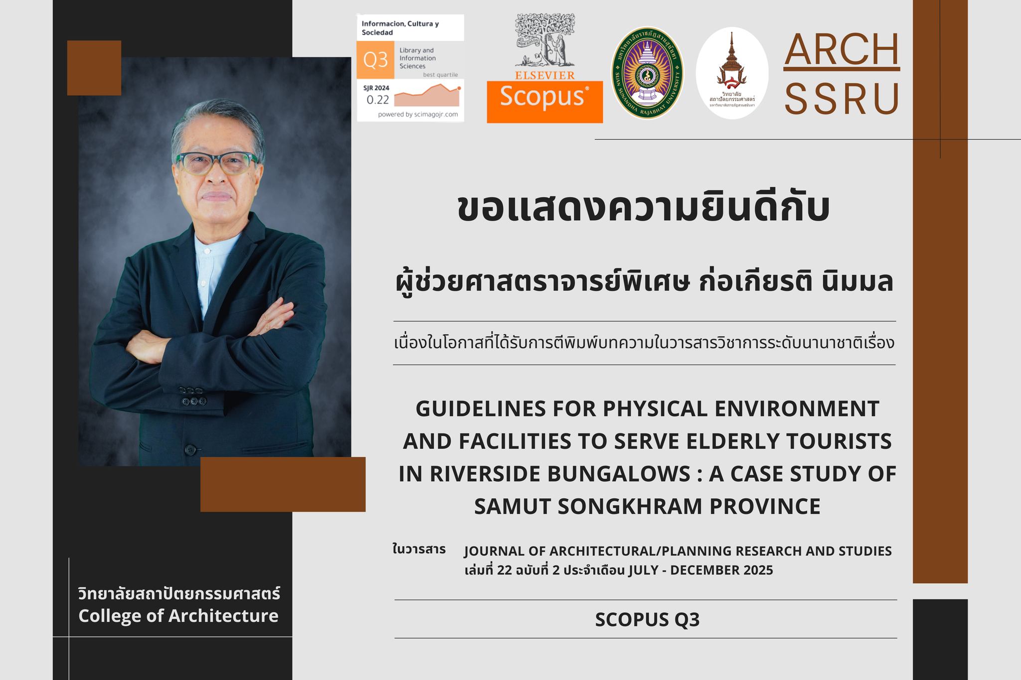 วิทยาลัยสถาปัตยกรรมศาสตร์ ขอแสดงความยินดีกับ ผู้ช่วยศาสตราจารย์พิเศษ ก่อเกียรติ นิมมล เนื่องในโอกาสที่ได้รับการตีพิมพ์บทความในวารสารวิชาการระดับนานาชาติเรื่อง Guidelines for Physical Environment and Facilities to Serve Elderly Tourists in Riverside Bungalows : A Case Study of Samut Songkhram Province ในวารสาร Journal of Architectural/Planning Research and Studies เล่มที่ 22 ฉบับที่ 2 ประจำเดือน July - December 2025 ซึ่งอยู่ในอยู่ในฐานวารสาร Scopus Q3