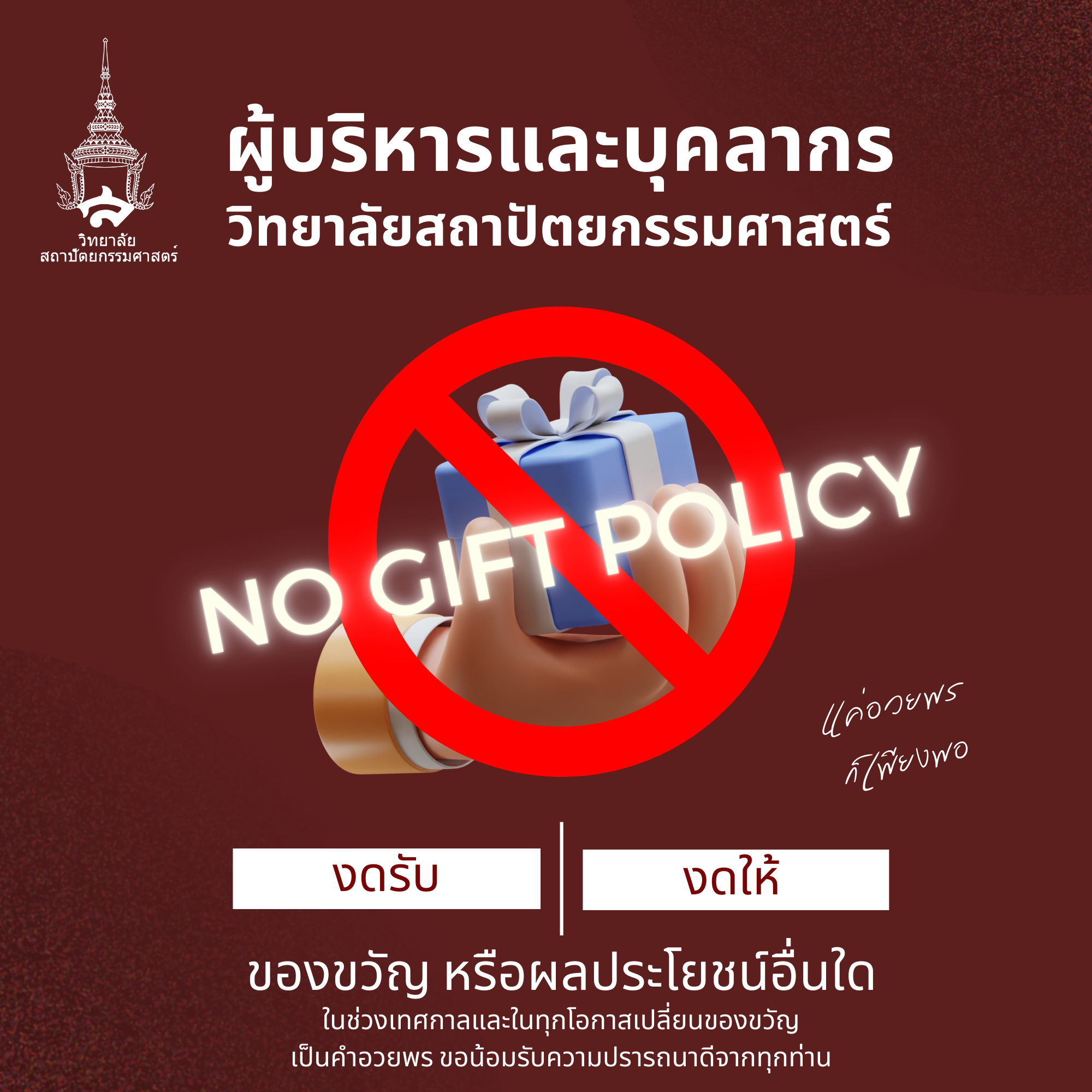 ผู้บริหาร และบุคลากร วิทยาลัยสถาปัตยกรรมศาสตร์ มหาวิทยาลัยราชภัฏสวนสุนันทา #งดการให้ #ไม่รับของขวัญ หรือผลประโยชน์อื่นใด ในช่วงเทศกาลและในทุกโอกาสเปลี่ยนของขวัญเป็นคำอวยพร ขอน้อมรับความปรารถนาดีจากทุกท่าน