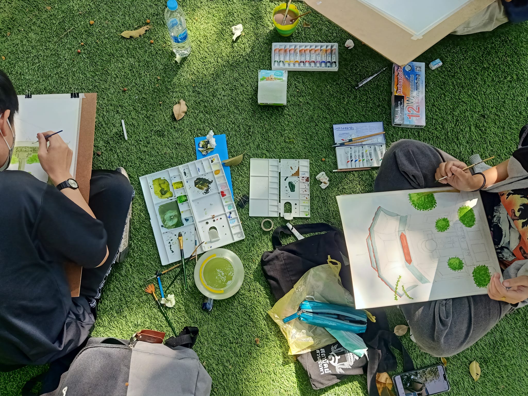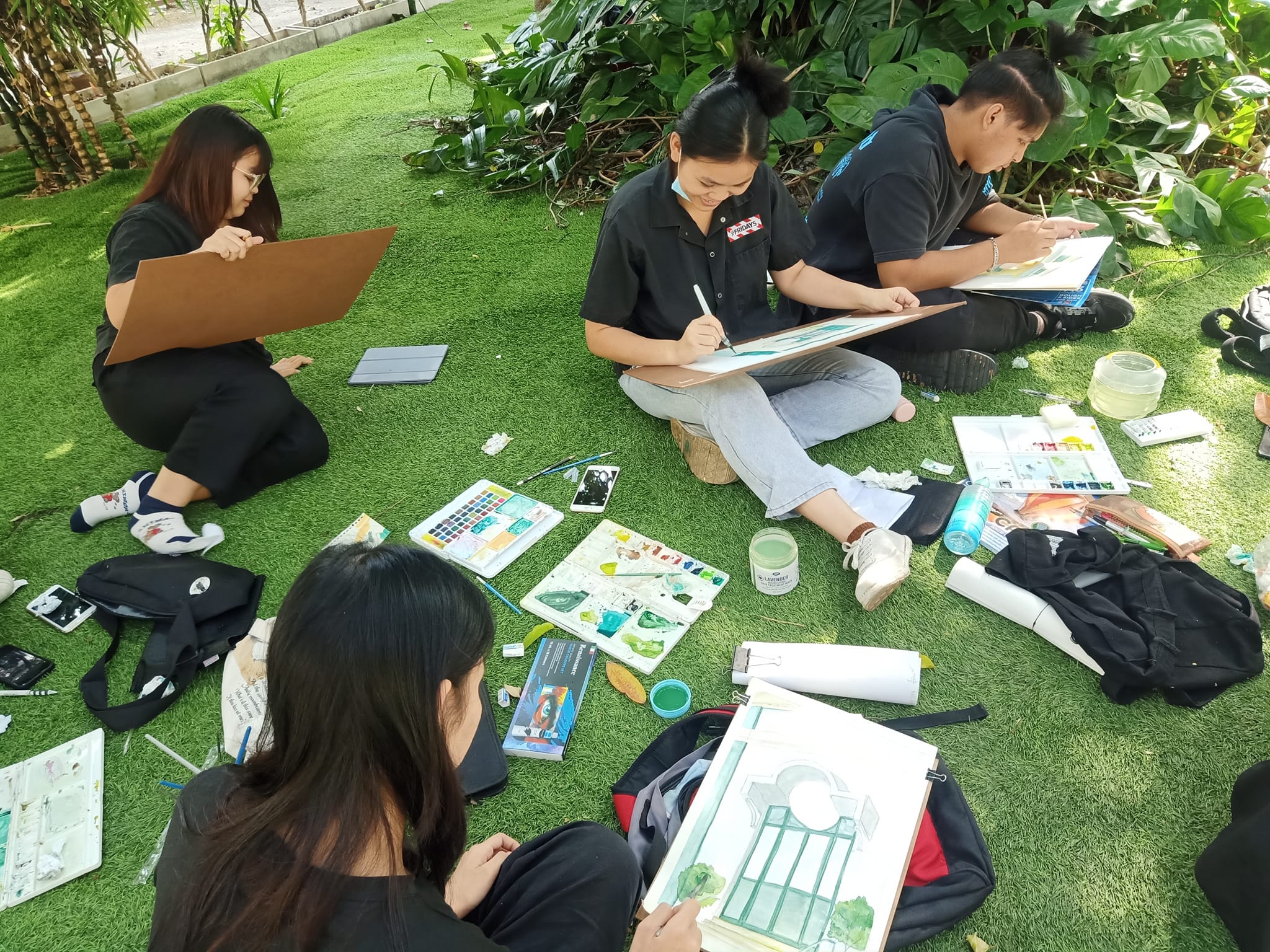 การวาดเส้นและแสดงผลงาน 2 นักศึกษาชั้นปีที่ 1 ลงพื้นที่ในมหาวิทยาลัย กับการวาดเส้นและฝึกฝนเทคนิคการลงสีโดยอยู่บนพื้นฐานแนวคิดหลักทฤษฎีและองค์ประกอบต่างๆของการวาดเส้นและการลงสีและเทคนิคที่ทำให้เกิดพื้นผิวชนิดต่างๆ ฝึกการรับรู้และแสดงออกด้วยเทคนิควิธีการใช้เครื่องมือและวัสดุในลักษณะต่างๆ เรียนรู้เกี่ยวกับการรับรู้และการแสดงออกในแง่ของความคิดสร้างสรรค์ที่กว้างขึ้นเพื่อให้สามารถนำความรู้เหล่านั้นไปประยุกต์ใช้เป็นพื้นฐานของการออกแบบงานสถาปัตยกรรมและงานออกแบบภายในต่อไป